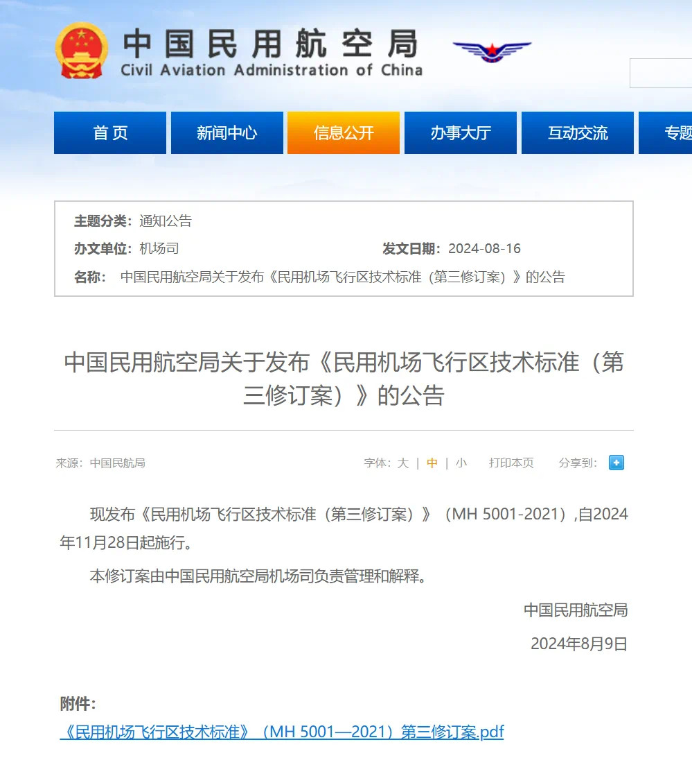 中國民用民航局發(fā)布《民用機場飛行區(qū)技術標準(第三修訂案)》(MH 5001-2021)