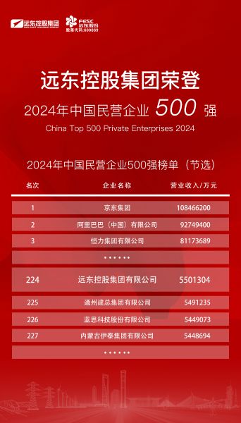 會上,全國工商聯(lián)發(fā)布了“2024中國民營企業(yè)500強”榜單,遠東與京東集團、阿里巴巴(中國)等知名企業(yè)共同登榜,位列榜單第224位,較上年前進4位。