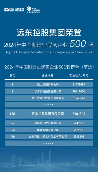 在同期發(fā)布的“2024中國制造業(yè)民營企業(yè)500強”榜單中,遠東光榮登榜,位列第156位。